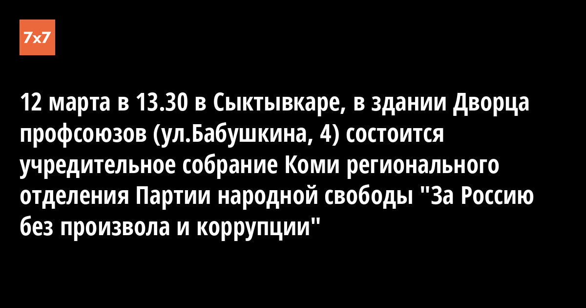 12 марта в 13.30 в Сыктывкаре, в здании Дворца профсоюзов (ул.Бабушкина, 4) состоится учредительное собрание Коми регионального отделения Партии народной свободы "За Россию без произвола и коррупции"