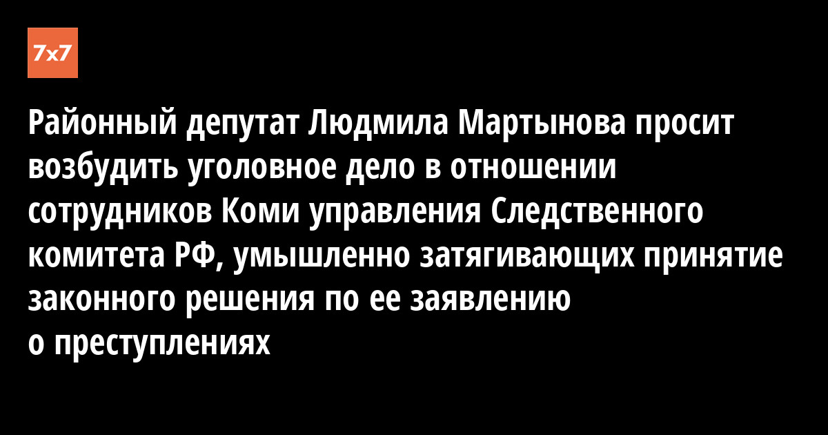 Сегодня, 19 августа, депутат Печорского райсовета Людмила Мартынова обжаловала очередное отказное постановление - на этот раз Следственного управления Следственного комитета (СУСК) РФ по Коми - на свою жалобу об отказе в возбуждении уголовного дела по ее заявлению о фактах фальсификации результатов мартовских выборов районного главы на двух избирательных участках. Кроме того, г-жа Мартынова обратилась в Следственный комитет РФ с просьбой возбудить уголовное дело в отношении сотрудников СУСК, которые, на ее взгляд, умышленно затягивают принятие законного решения по ее заявлению о преступлениях.