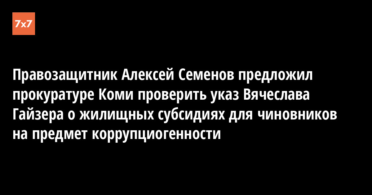 Член Коми правозащитной комиссии «Мемориал» Алексей Семенов направил в интернет-приемную прокуратуры Коми заявление с просьбой проверить указ главы РК Вячеслава Гайзера от 26 августа с.г. «О предоставлении государственным гражданским служащим Республики Коми единовременной субсидии на приобретение жилого помещения» на предмет его возможной коррупциогенности.