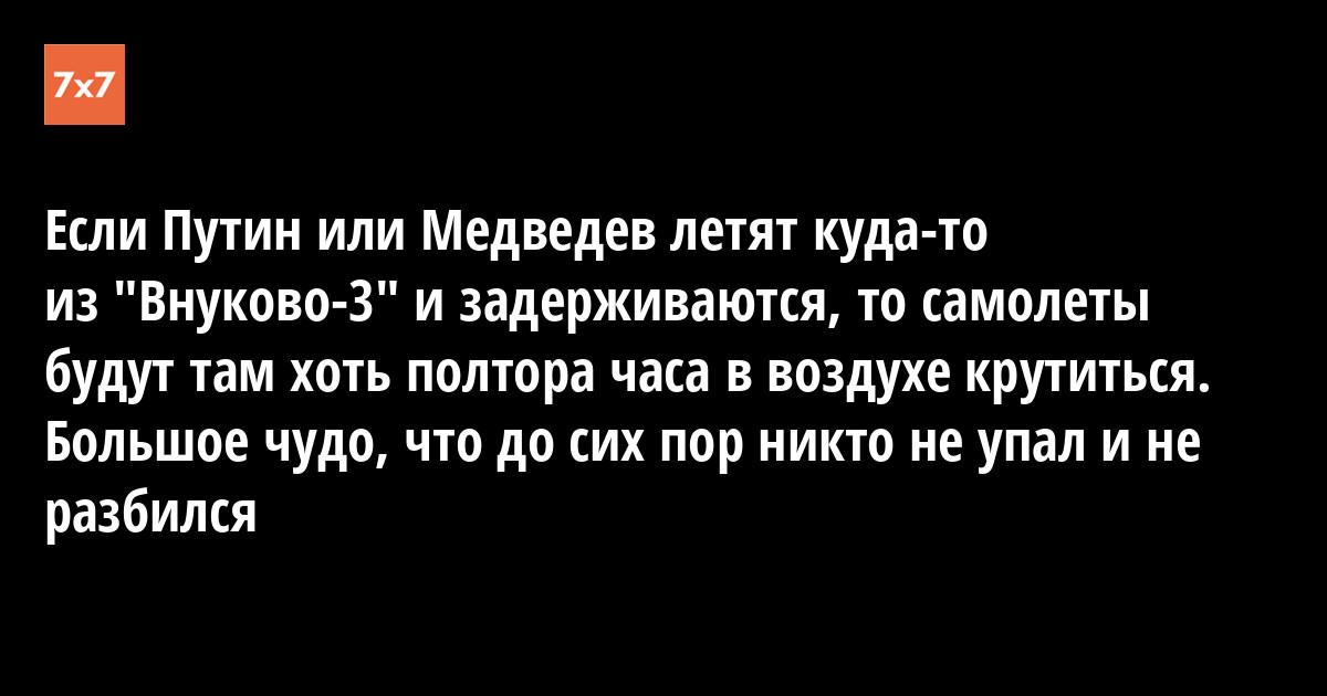 Потому что если Путин или Медведев летит куда-то из «Внуково-3» и задерживается, то самолеты будут там хоть полтора часа в воздухе крутиться. И как до сих пор никто не упал и не разбился, это большое чудо. И это касается не только Путина и Медведева, это касается и других мигалок. Потому что эти ребята не представляют себе, что аэродром может закрыться, что опаздывать на три часа на взлет нельзя.