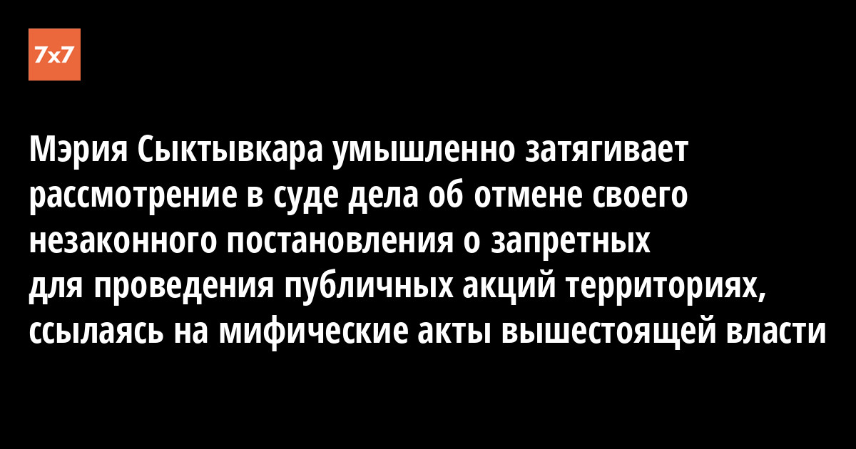 Мэрия Сыктывкара умышленно затягивает рассмотрение в суде дела об отмене своего незаконного постановления о запретных для проведения публичных акций территориях, ссылаясь на мифические акты вышестоящей власти