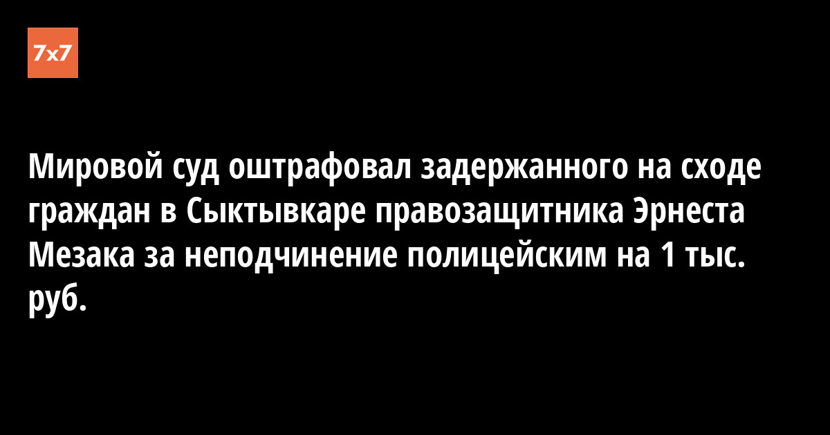 Сегодня мировой судья Первомайского судебного участка Сыктывкара Максим Марков принял решение оштрафовать на 1 тыс. руб. за неподчинение сотрудникам полиции члена правления Коми правозащитной комиссии «Мемориал» Эрнеста Мезака, задержанного правоохранителями 10 декабря на Театральной площади Сыктывкара во время схода граждан.