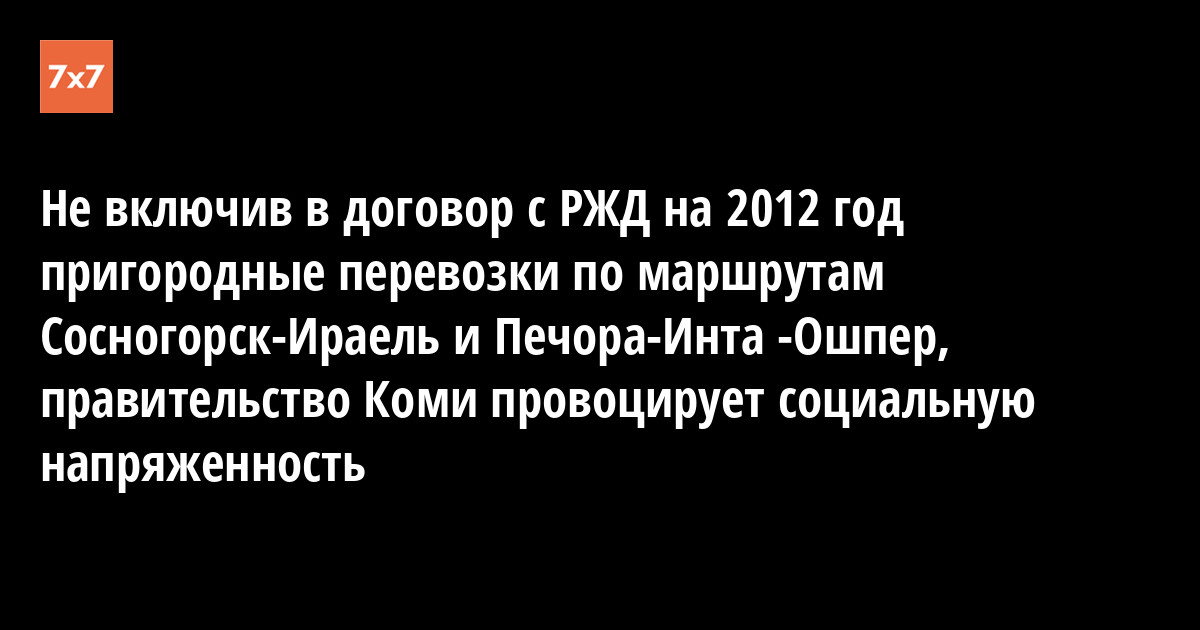 «7x7» сообщал о социальной напряженности, возникшей летом с.г. по причине того, что республиканская власть не включила в договор с «СППК» пригородные поезда Сосногорск — Ираель — Сосногорск и Печора — Инта — Ошпер — Печора. С обращением по поводу возникшей напряженности тогда выступила председатель Общественной палаты Коми Маргарита Колпащикова, правда, обратилась она почему-то не к руководству Коми, а к президенту ОАО «РЖД» Владимиру Якунину.