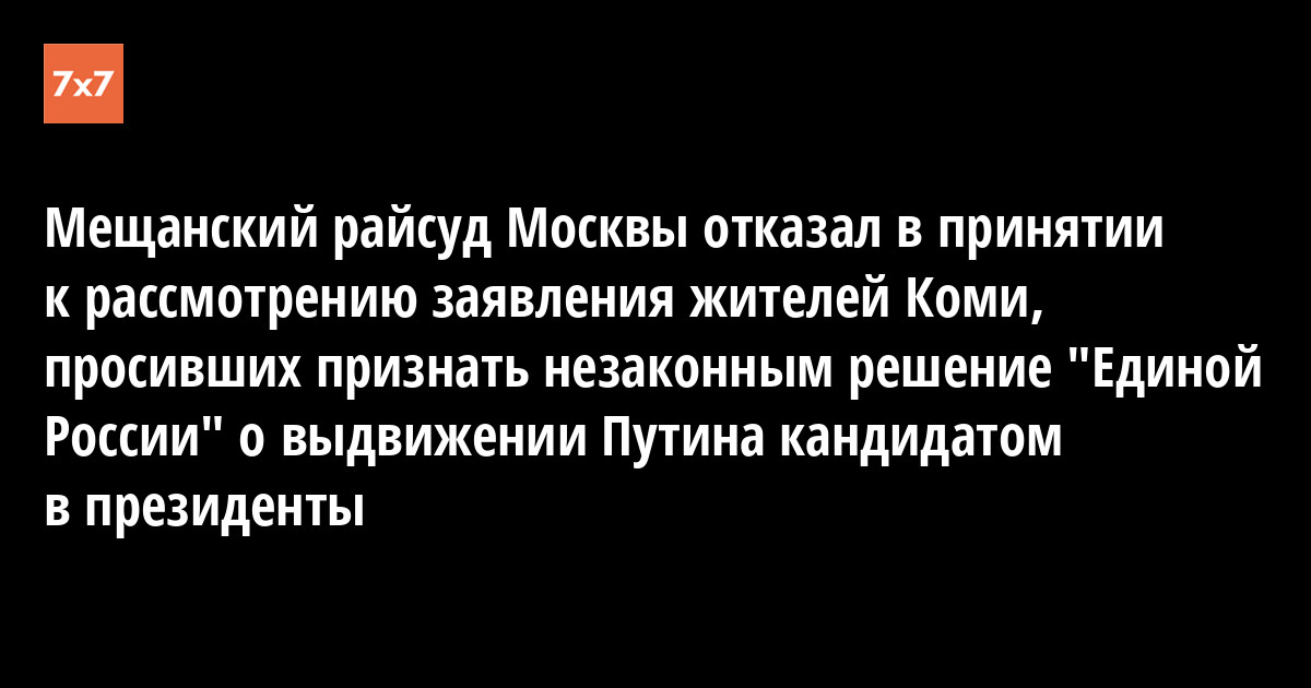 Как стало известно «7x7», 30 января судья Мещанского райсуда Москвы Юлия Мордвина вынесла определение об отказе принятия заявления 12 жителей Коми, которые просили суд признать незаконным решение съезда партии «Единая Россия» о выдвижении Владимира Путина кандидатом на должность президента РФ и обязать вышеназванную партию провести внеочередной съезд, на котором отменить свое решение.
