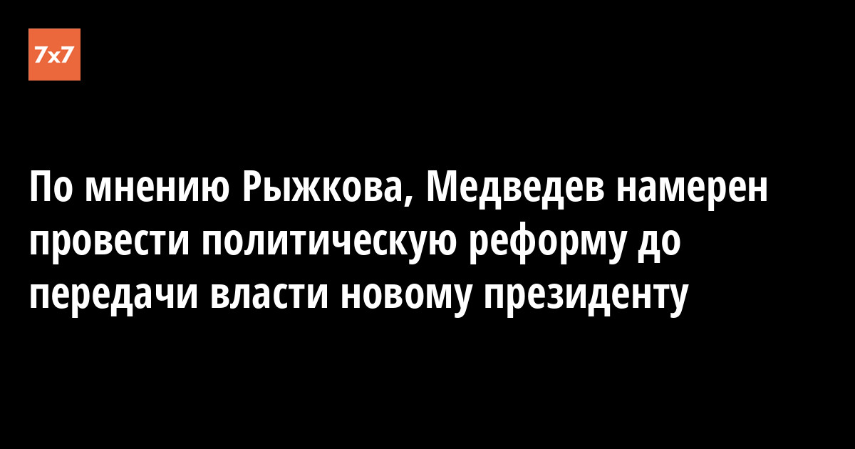 Президент Дмитрий Медведев хочет провести политическую реформу до передачи власти новому президенту. Об этом в эфире "Радио Свобода" заявил сопредседатель Партии народной свободы Владимир Рыжков после встречи с Медведевым. "Он хочет, чтобы мы тоже принимали участие в реализации реформ, которые он инициировал". При этом, по словам Рыжкова, если реформа будет реализована, она "запустит процессы, которых никто не сможет повернуть назад". "Это уходящий человек, но это человек, который искренне хочет напоследок провести политическую реформу" .