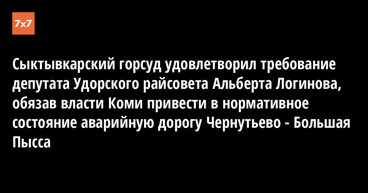 Сегодня Сыктывкарский городской суд частично удовлетворил исковое заявление депутата совета Удорского района, жителя деревни Малая Пысса Альберта Логинова, требовавшего обязать главу Коми Вячеслава Гайзера и Дорожное агентство РК привести автодорогу общего пользования Кослан - Большая Пысса – Латьюга - Зубово в безопасное состояние и взыскать с ответчиков компенсацию морального вреда в размере 1 млн. 289 тыс. руб.