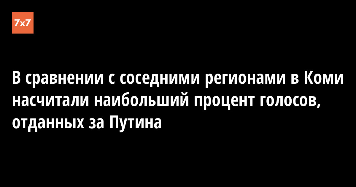 Коми с ее 65,02% оказалась на 26 месте. Во всех соседних с республикой регионах Путин получил меньше: в Свердловской области — 64,50%, в Пермском крае — 62, 94%, в Вологодской области — 59, 44%, в Архангельской области — 57,97%, в Кировской области — 57,93%, в Ненецком автономном округе — 57,05%.
