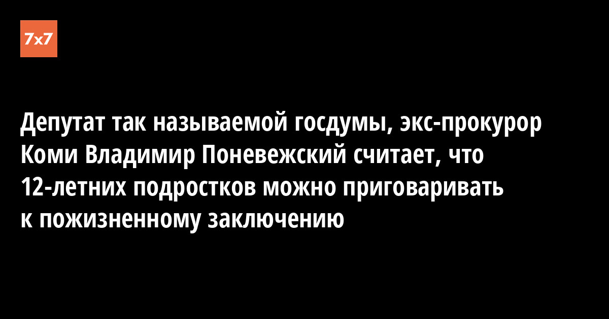 Как стало известно «7x7», бывший прокурор Коми Владимир Поневежский, незаконно избранный в депутаты так называемой госдумы, является одним из инициаторов разработки законопроекта о снижении возраста, с которого подростков можно привлекать к уголовной ответственности за наиболее жестокие преступления, с 14-ти до 12-ти лет.