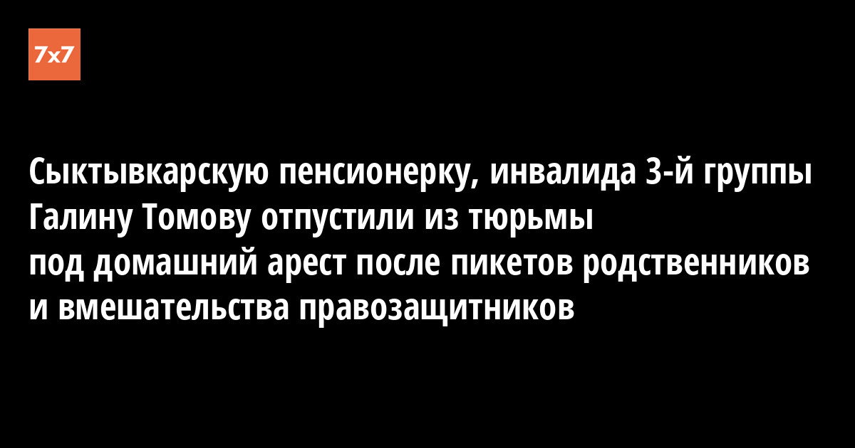 Сегодня, 23 марта, судья Сыктывкарского горсуда Александр Печинин вынес постановление об изменении пенсионерке и инвалиду 3 группы Галине Томовой меры пресечения - с содержания под стражей на домашний арест. Двумя днями ранее муж и дочь г-жи Томовой провели в центре города одиночные пикеты с требованием отменить решение мирового судьи Катаевского судебного участка столицы республики Юлии Агранович об аресте больной женщины, обвиняемой в преступлении незначительной тяжести.