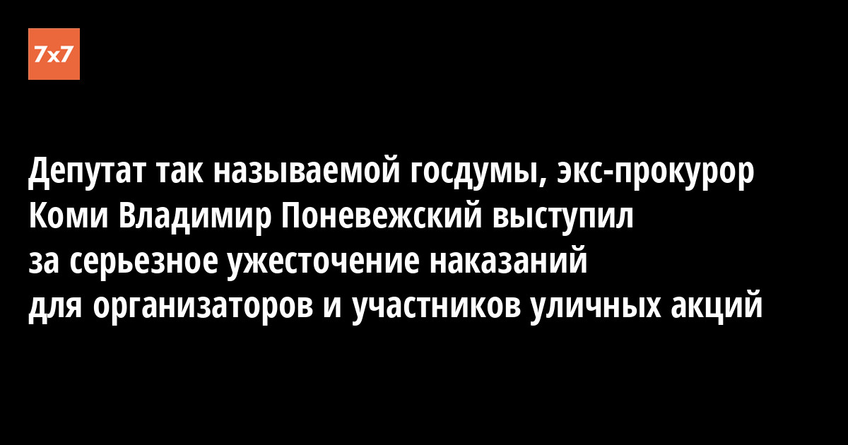 Бывший прокурор Коми Владимир Поневежский, незаконно избранный в депутаты так называемой госдумы, стал одним из инициаторов внесенного вчера на рассмотрение комитета по конституционному законодательству и государственному строительству, заместителем председателя которого он является, законопроекта о серьезном ужесточении наказаний за нарушение правил организации и проведения уличных акций.