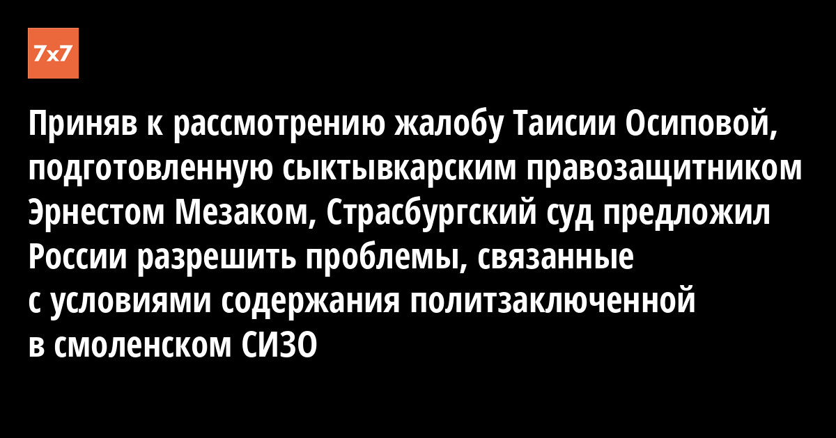 Как сообщил сегодня «7x7» член правления Коми правозащитной комиссии «Мемориал» Эрнест Мезак, являющийся также юристом Фонда содействия защите прав и свобод граждан «Общественный вердикт», Европейский суд по правам человека (ЕСПЧ) принял к рассмотрению подготовленную им жалобу политзаключенной Таисии Осиповой на бесчеловечные условия содержания в смоленском СИЗО, где она содержится как обвиняемая в покушении на незаконный сбыт наркотиков и приготовлении к сбыту наркотиков в особо крупном размере.