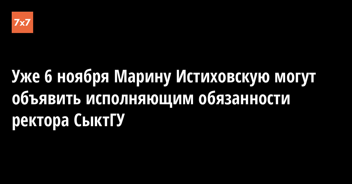 Как сообщил нашему сайту источники из СыктГУ, 6 или 7 ноября Марина Истиховская будет представлена как исполняющий обязанности ректора университета.
