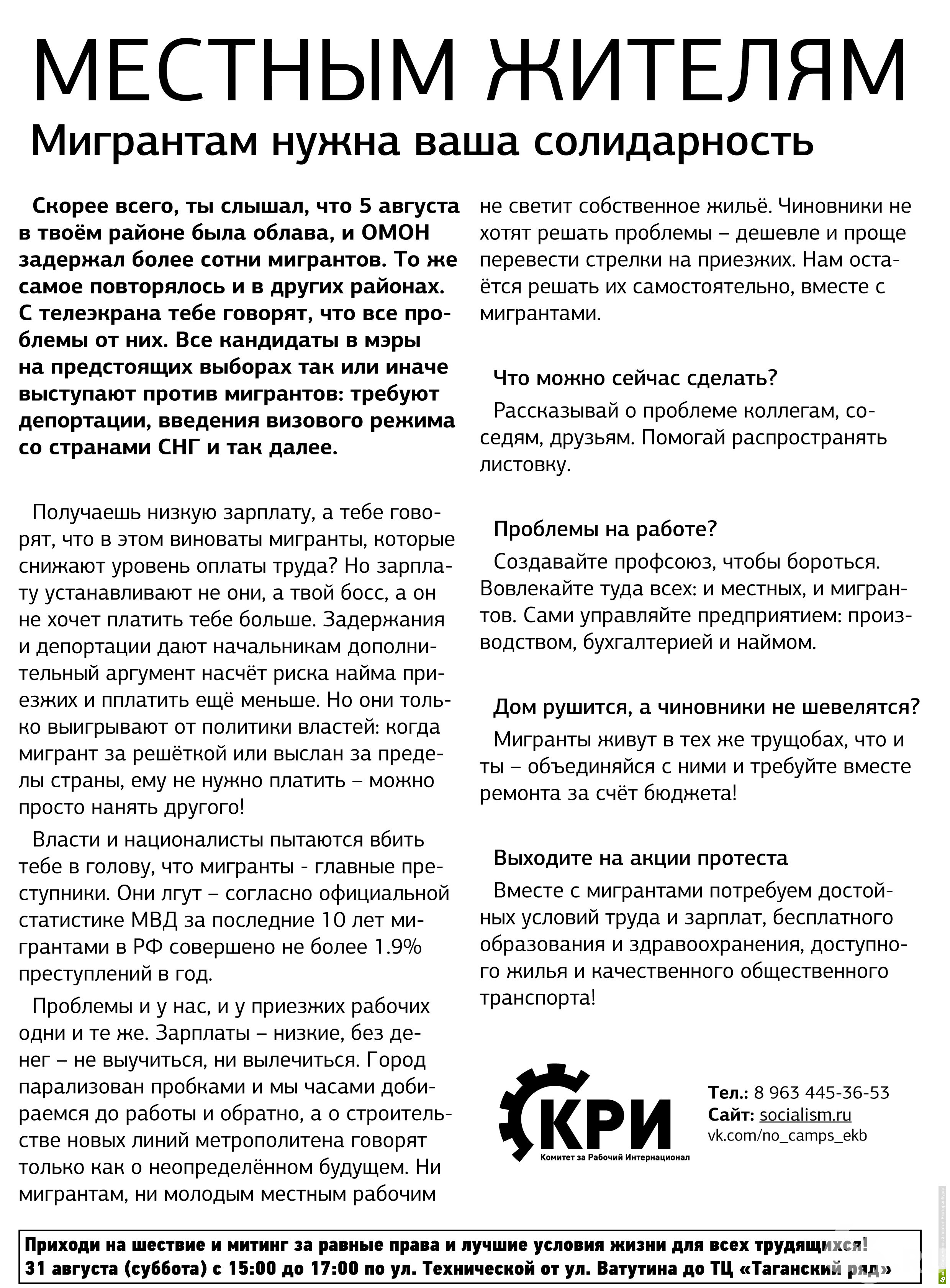 В субботу, 31 августа, в Екатеринбурге пройдет шествие в защиту прав трудовых мигрантов. Участники пройдут с лозунгами "Нет полицейскому беспределу", "Нет незаконным проверкам документов", "Нет депортациям и концлагерям", "Равная оплата - за равный труд" от улицы Ватутина до ТЦ "Таганский ряд", где затем состоится митинг. На акции ожидается около 100 человек.