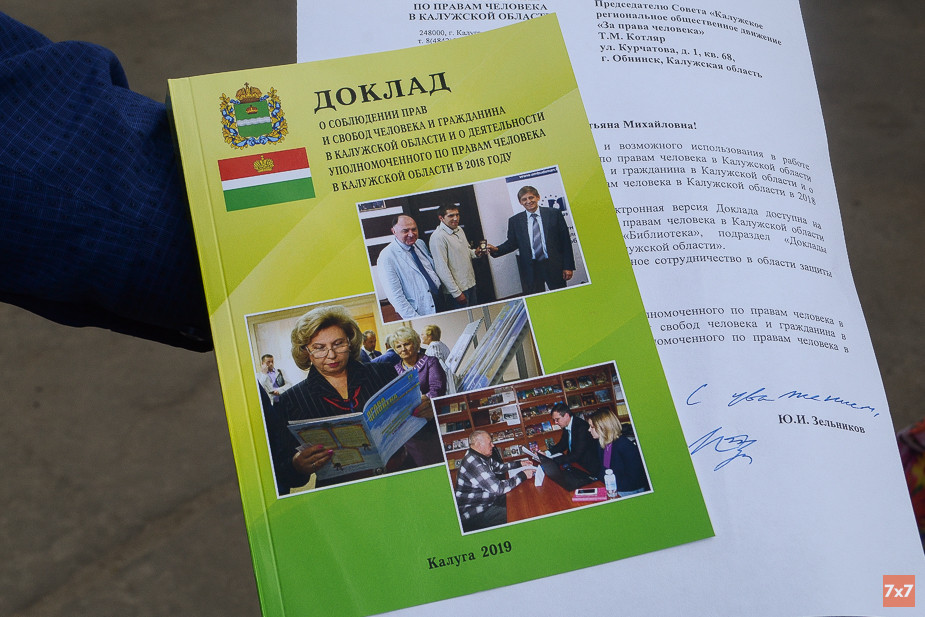 Юрий Зельников привез Татьяне Котляр экземпляр доклада о соблюдении прав человека в Калужской области за 2018 год. По словам Мосеевой-Элье, правильнее было бы назвать его «докладом о нарушении прав человека».