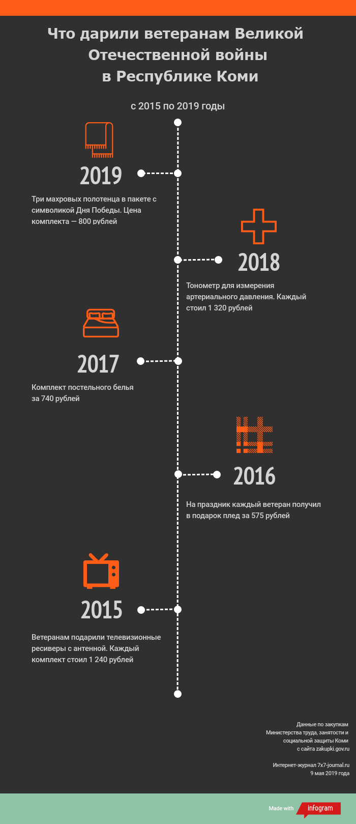 По данным отделения Пенсионного фонда по Коми, на 8 мая 2019 года в республике живут 148 ветеранов Великой Отечественной войны и 39 граждан, награжденных знаком «Жителю блокадного Ленинграда». Министерство труда, занятости и социальной защиты Коми на День Победы ежегодно покупает и дарит ветеранам подарки. Интернет-журнал «7x7» изучил эти закупки за последние пять лет. На них потратили 921 тыс. руб. Почти столько же в 2018 году министерство потратило на канцтовары.