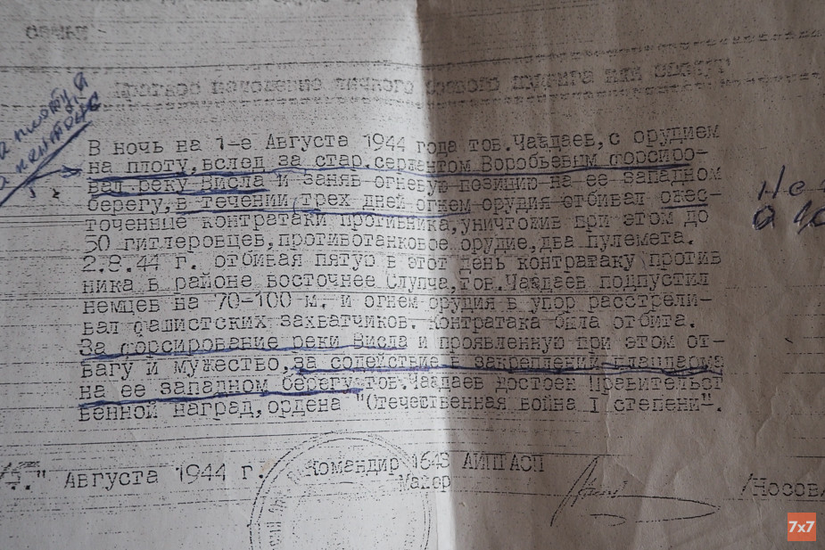 Рязанец Николай Чадаев с начала войны работал на трудовом фронте и отправился сражаться в 1943 году, как только ему исполнилось 17 лет. По его словам, он первым в ночь на 1 августа 1944 года форсировал реку Вислу на плоту с артиллерийским орудием, но в наградном листе написали, что переправился «вслед за старшим сержантом Воробьевым». Несколько лет Чадаев добивается исторической справедливости, но чиновники отделываются обещаниями, отправляют его письма из инстанции в инстанцию и часто «отвечают невпопад, да и вообще какую-то ерунду». Накануне Дня Победы корреспондент «7x7» побывал у Николая Кузьмича и записал его воспоминания о войне, «втором рождении» после контузии и попытках добиться правды.