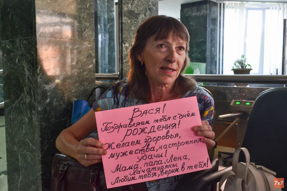 Мать Василия Куксова Алла пришла на заседание с плакатом, на котором сына поздравляют с днем рождения его друзья и семья и желают мужества, удачи и настроения.