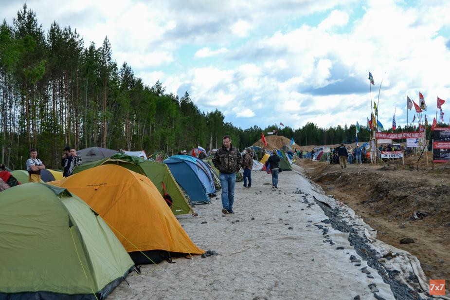 На насыпи, где, вероятно, должна была проходить дорога (иначе технике на Шиесе не проехать: болотистая местность всегда в воде), теперь располагается палаточный лагерь. Вместо 20–30 палаток, которые располагаются здесь обычно, разместились, по подсчетам активистов, все 170. На импровизированной кухне под навесом, за столами и около костров не протолкнуться: оживленные очереди из активистов двигаются туда-сюда, то и дело тормозя в «пробках».