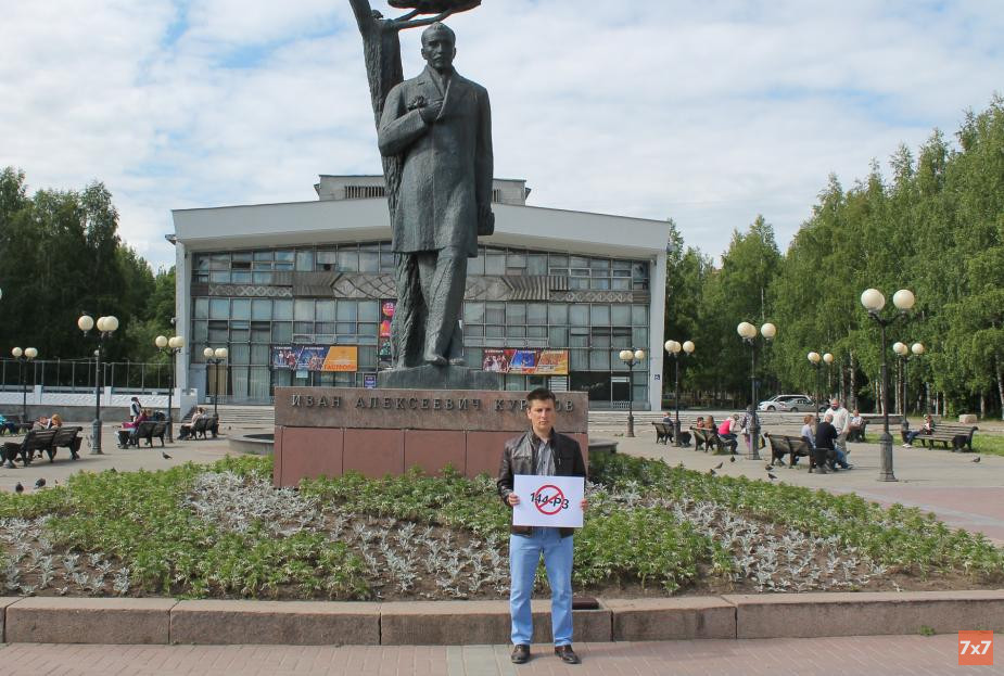 На Театральной площади в 14:00 на одиночный пикет вышел еще один житель Сыктывкара Анатолий Третьяков. Через 25 минут у площади остановилась служебная машина, из которой вышли двое полицейских. Сначала они пошли в другую сторону, но потом заметили активиста и направились к нему. На вопрос корреспондента «7x7» приехали ли они по вызову, полицейский отрицательно помотал головой.