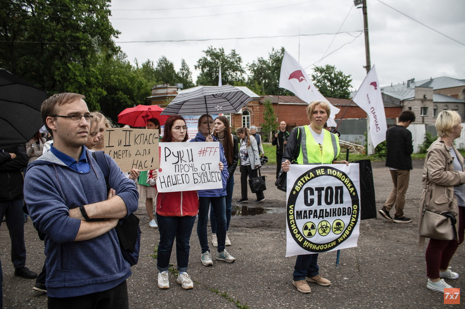 Около 600 жителей Кирова пришли 30 июня в сквер Степана Халтурина на митинг против строительства завода по утилизации отходов I и II классов опасности на базе закрытого комплекса по уничтожению химического оружия «Марадыковский». Участники митинга потребовали от правительства отказаться от этого проекта и запретить ввоз опасных отходов из других регионов. Несколько выступлений протестующих — в репортаже «7х7».