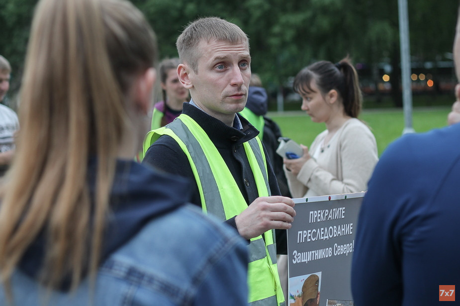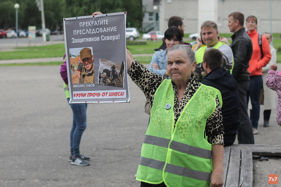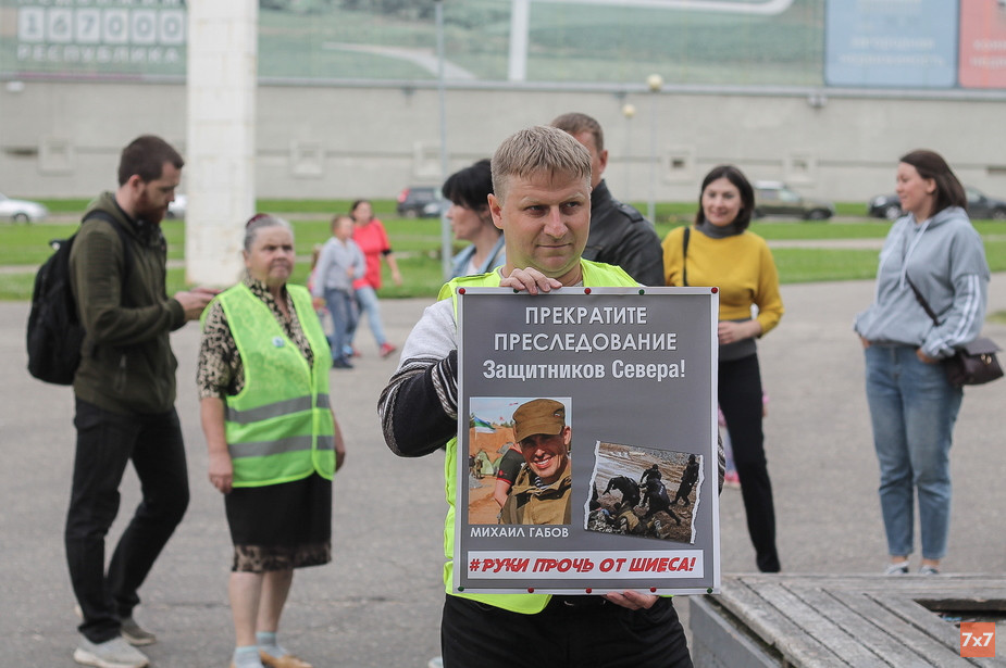 В Сыктывкаре 8 июля на площади около центрального бассейна несколько активистов выстроились в очередь, чтобы постоять в пикете. Они поочередно держали плакат, на котором была фотография обвиненного в нападении на сотрудника охранного предприятия Михаила Габова и требование прекратить преследование защитников Севера. На пикете побывал корреспондент «7x7».