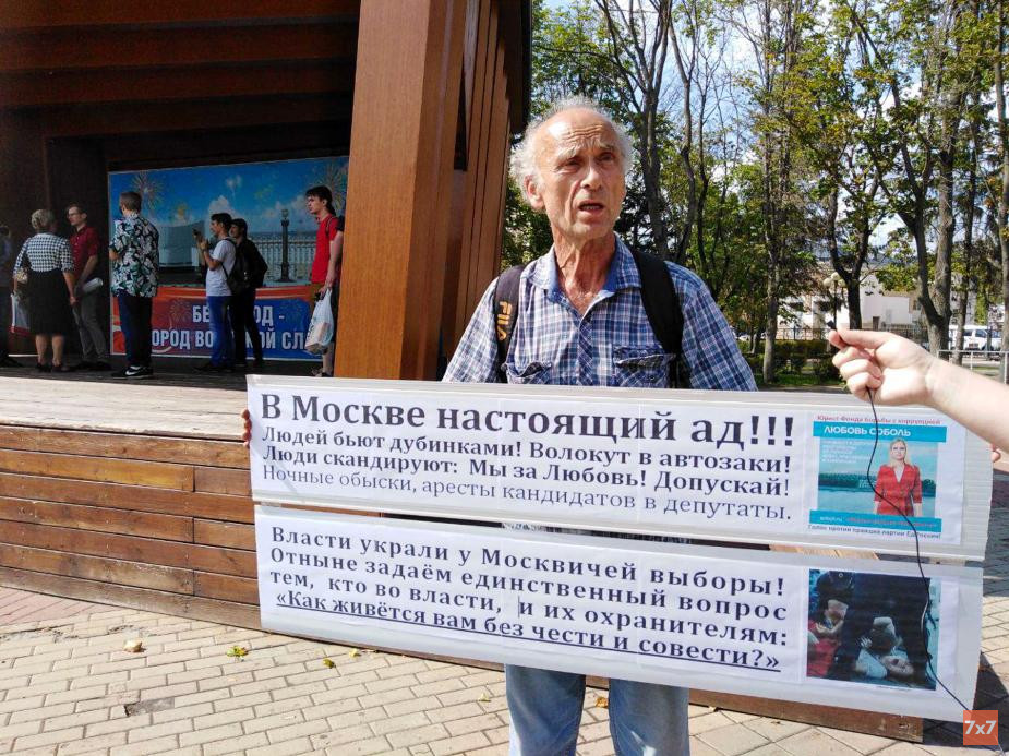 Около 30 человек вышли с флагами России и плакатами, критикующими действия полицейских во время протестных митингов в Москве, где люди требовали допустить независимых кандидатов на выборы. Участники пикета скандировали лозунги в поддержку юриста Фонда борьбы с коррупцией Любови Соболь, которую задержали перед согласованной акцией в Москве. Задержаний или провокацией во время пикета не было. Но за день до пикета сотрудники полиции ходили по квартирам сторонников Алексея Навального и требовали подписать предостережение об экстремизме.