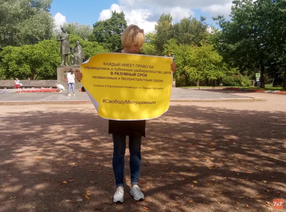 Мать обвиняемого в сбыте наркотиков активиста ликвидированного движения "Открытая Россия" Артёма Милушкина Ирина развернула плакат с требованием справедливого расследования уголовного дела ее сына. Член либертарианской партии Николай Никифоров развернул флаг с надписью Don't tread on me (Не наступай на меня). После акции полицейские — их было в два раза больше, чем участников — переписали паспортные данные пикетчиков.