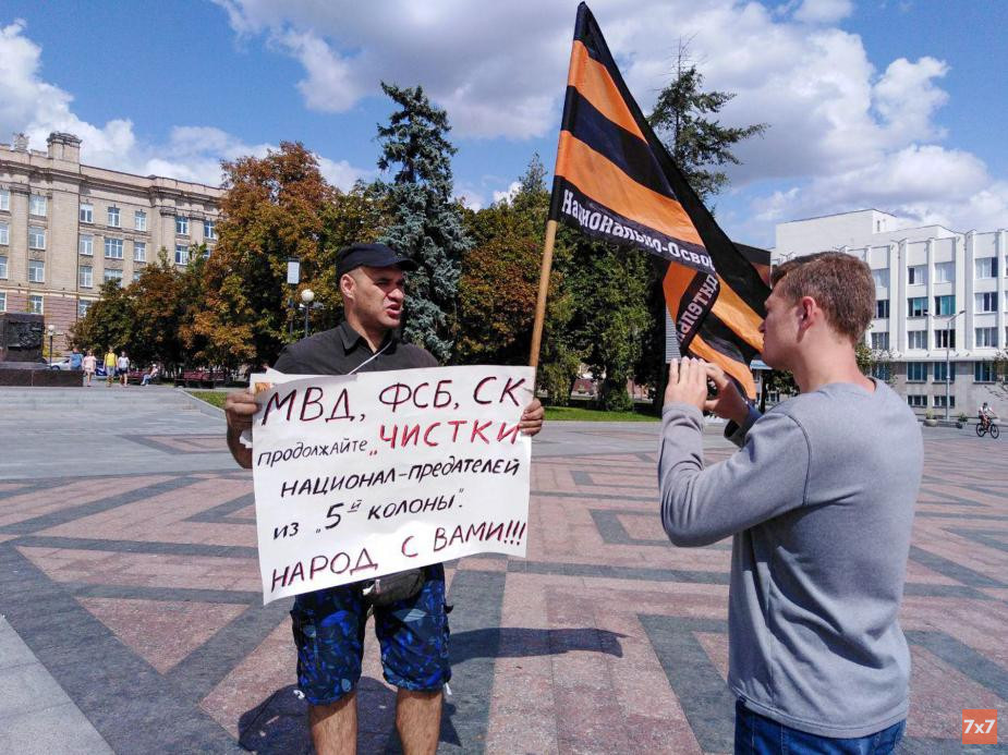 Сторонники Навального и другие белгородцы в итоге не смогли выйти на одиночный сменяемый пикет возле областного правительства на Соборной площади. Это место занял участник Национального освободительного движения (НОД). На его плакате утверждалось, что силовики должны провести чистки в "пятой колонне".