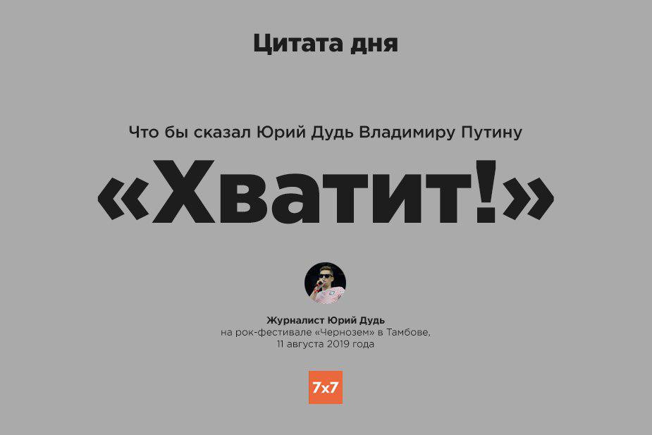 Журналист, автор одного из самых популярных YouTube-каналов в России «вДудь» Юрий Дудь ответил со сцены на вопрос солистки группы «Мураками» Диляры Вагаповой о том, что бы он сказал президенту России Владимиру Путину, если бы перед ним оказался. Такой вопрос Дудь сам неоднократно задавал героям своих интервью. Журналист ответил, что сказал бы то же самое, что сказал музыкант Сергей Шнуров на его программе: слово «Хватит». Диалог между Вагаповой и Дудем состоялся 11 августа на рок-фестивале «Чернозем» в Тамбове, где блогер был ведущим мероприятия.