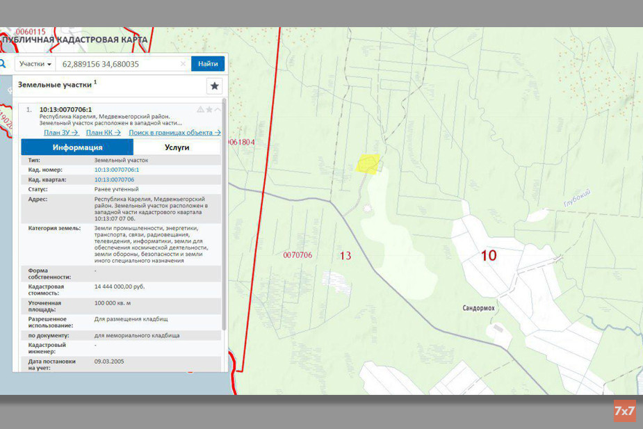 «7x7» взял геотег с фотографии, сделанной в урочище, и вбил координаты в кадастровую карту. Геометка совпадает с координатами урочища Сандармох.