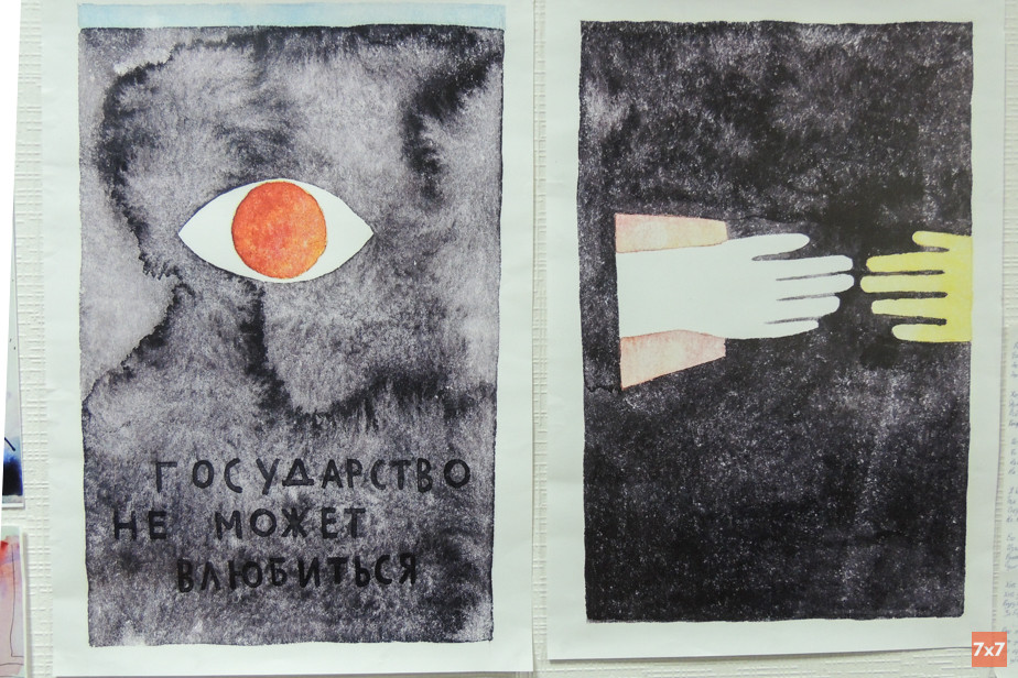 После читки стихов организаторы провели для «7x7» экскурсию по выставке рисунков фигурантов и солидарных художников. Они пояснили, что жанр всех работ — это остросоциальный арт против насилия.