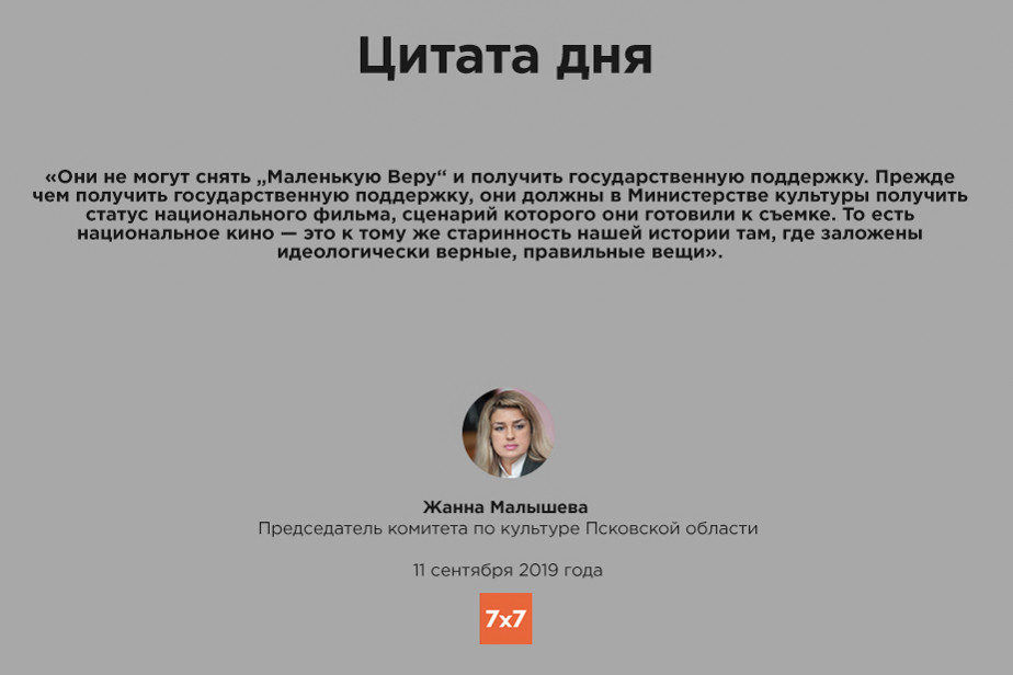 Председатель облкомитета по культуре Жанна Малышева при рассмотрении в комитете регионального заксобрания проекта закона «О государственной поддержке кинематографии в Псковской области» 11 сентября сказала, что кинопроизводители могут рассчитывать на компенсацию затрат на съемку только "национального кино", в котором "заложены идеологически верные, правильные вещи".