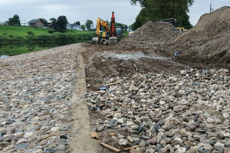 Работы по берегоукреплению начались летом 2018 года, причем сразу с нарушений. Подрядчик — ООО «Магистраль» — стал вбивать сваи в дно реки, хотя по проекту он должен был вдавливать их гидравлическим прессом. Как это повлияло на памятники архитектуры, стоящие на берегу, неизвестно. В документации нет даже раздела по обеспечению сохранности старинных зданий.