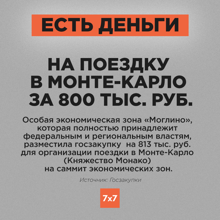 Двое сотрудников открытой экономической зоны «Моглино» поедут в Монте-Карло на «Всемирный саммит для свободных и особых экономических зон». Стоимость поездки может достигать 800 тыс. руб. При этом организация «Моглино» полностью принадлежит государству (на 89% Министерству экономического развития России и на 11% — Госкомимущества Псковской области). Депутат Псковского областного собрания Лев Шлосберг считает, что "Моглино" стало "вагоном СВ" для "чиновничьего туризма".