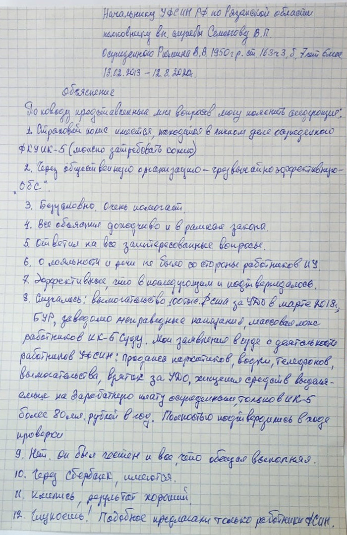 Осужденный Валерий Рюмин дал пояснения на имя начальника УФСИН по Рязанской области Валерия Семенова 25 ноября. По словам заключенного, его страховой полис имеется в личном деле, он узнал о возможности страхования жизни и здоровья заключенных «через чрезвычайно эффективную общественную организацию „ОБС“ [одна баба сказала]». Работу страхового агента Рюмин описал следующим образом: подробно ответил на все вопросы, был честен, свои обязательства выполнил.