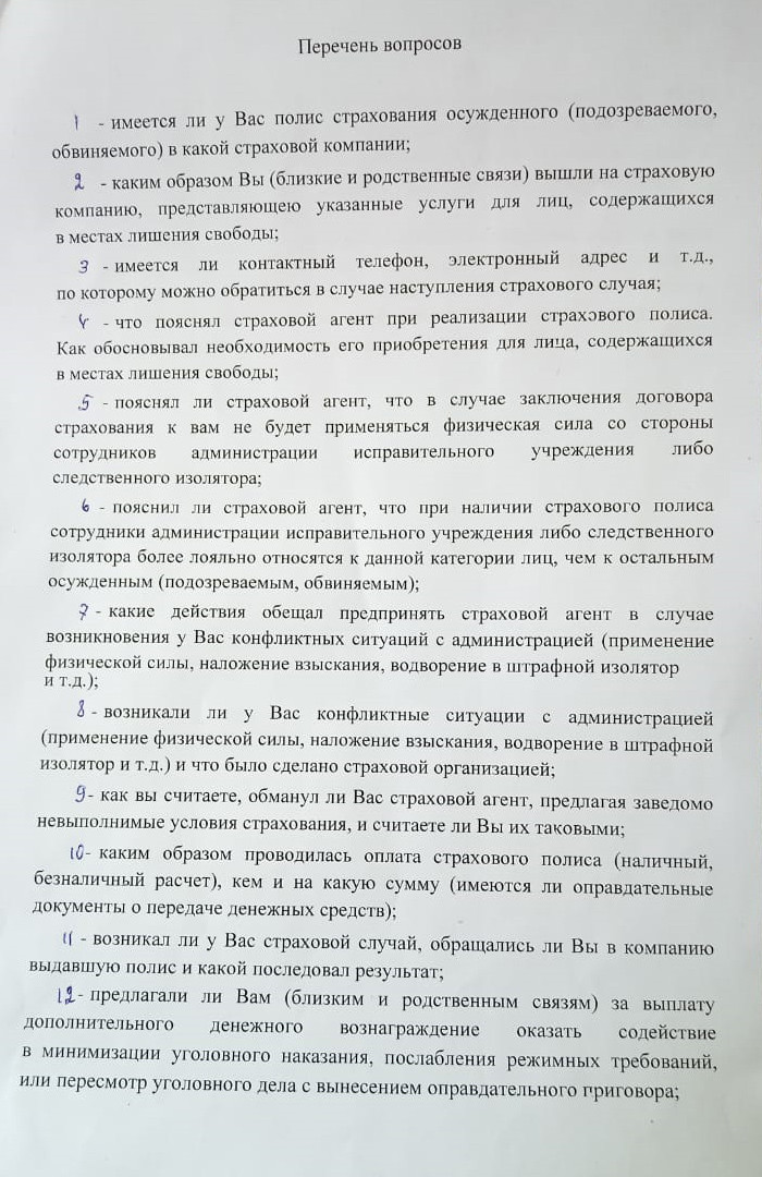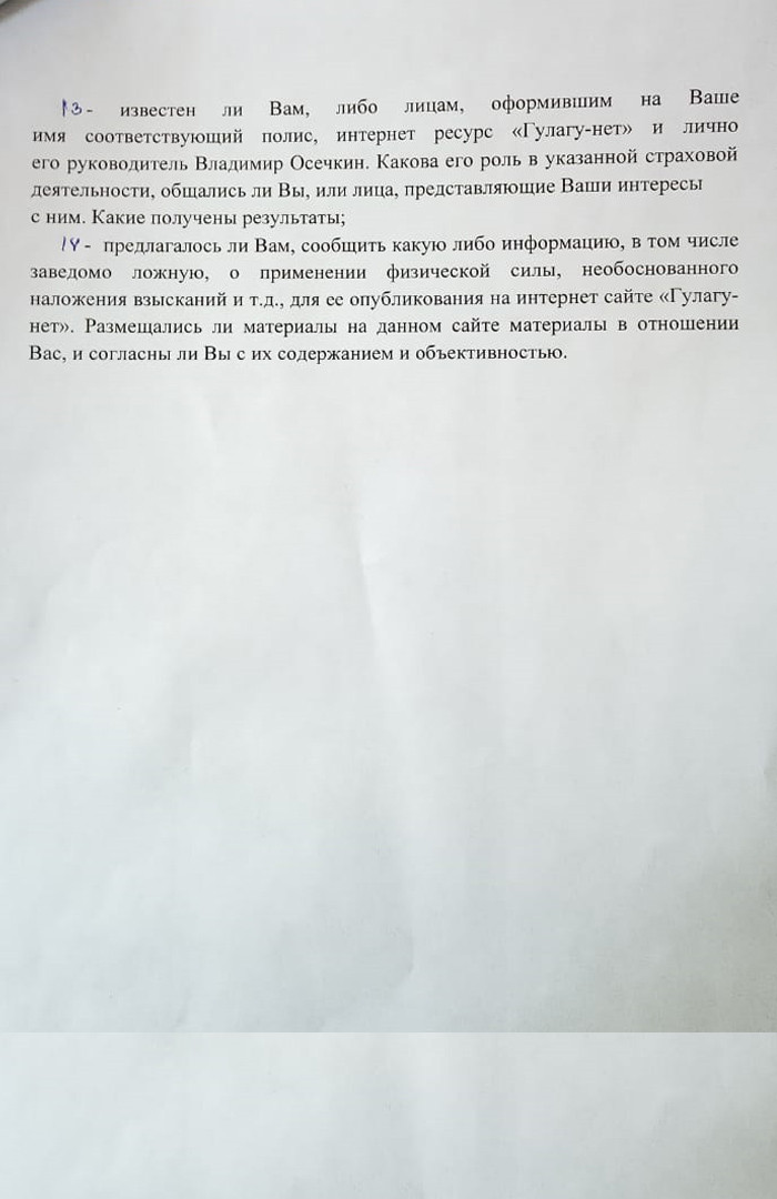Экс-чиновник передал правозащитнику Евгению Кутузову анкету с 14 вопросами от руководства колонии. Вопросы были посвящены наличию или отсутствию страхового полиса, работе страхового агента с заключенным, а также взаимоотношениям респондента с Владимиром Осечкиным. Также у зэков спрашивали, были ли у них конфликтные ситуации с администрацией исправительного учреждения или СИЗО, обращались ли они в страховую компанию, получали ли выплаты, передавали ли Осечкину информацию, «в том числе заведомо ложную, о применении физической силы, необоснованного наложения взысканий и т. д. для ее опубликования на интернет-сайте Gulagu.net».