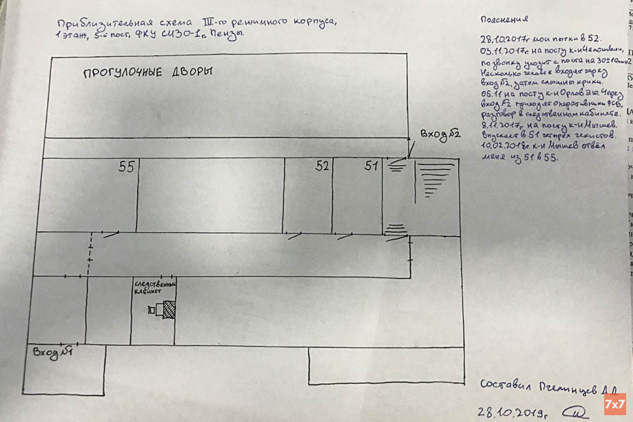 ― На листочке Пчелинцев нарисовал место, где его пытали. Потом я показала эту схему камеры Шакурскому. Он подтвердил, что это место, где были его пытки 3 ноября [2017 года]. Это здание в центре СИЗО, которое не используется.