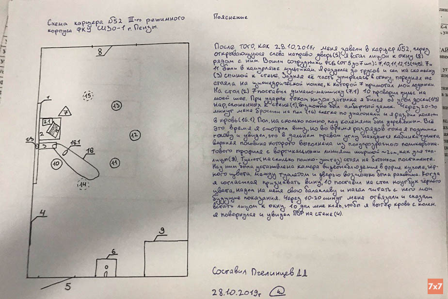 После того как 28.10.2017 г. меня завели в карцер №52, через открывающуюся слева направо дверь (5) я встал лицом к окну (8) рядом с ним. Вошли сотрудники ФСБ (от 5 до 7 шт.): 7, 10, 11, 12, 13 (14, 15). 7 и 11 были в камуфляже мультикам. Я разделся до трусов и сел на скамейку (3) спиной к стене. Задняя ее часть упиралась в стену, передняя стояла на цилиндрической ножке, к которой 7 примотал мои лодыжки. На стол (2) 7 поставил динамо-машинку (7.1), 10 проверил пульс на моей шее. При ударах током низом затылка я бился об угол доски (1/3) нар, сложенных к стене (1), возможно, был амбарный замок. Через 20–30 минут меня бросили на пол (16) по диагонали, и я разбил колени в кровь (16.1). Пол, насколько помню, под коленями был деревянным. Все это время я смотрел вниз, но вовремя разрядов тока я поднимал голову и увидел, что в дальнем правом углу находится кабинка туалета, верхняя половина которого выполнена из полупрозрачного поликарбонатового профиля с вертикальными линями шириной примерно 2 см, как для теплицы (9). Туалет (насколько помню — унитаз) стоял на бетонном постаменте. Над ним была установлена камера видеонаблюдения в виде купола черного цвета. Между туалетом и дверью, возможно, была раковина. Когда я согласился признавать вину, [сотрудник] 10 поставил на стол ноутбук, надел на меня свою балаклаву и начал читать с него мои будущие показания. Через 10–20 минут меня отвязали и сказали встать лицом к окну. 10 дал мне кляп, чтобы я вытер кровь с колен. Я повернулся и увидел ПВР [правила внутреннего распорядка] на стене (4).
