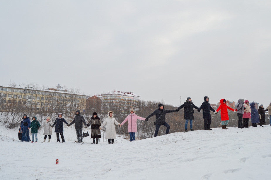 Чтобы привлечь внимание горожан к проблеме застройки, активисты вышли на акцию «обними лог». Взявшись за руки, они встали в цепочку, имитируя объятия зеленой зоны. По окончании акции участники скатились на тюбингах в лог. Как рассказал «7х7» член экодвижения «Зеленый хоровод» Дмитрий Велижанин, идею акции организаторы позаимствовали у жителей Сургута, которые, «обняв» парк, смогли добиться переноса строительства автовокзала.