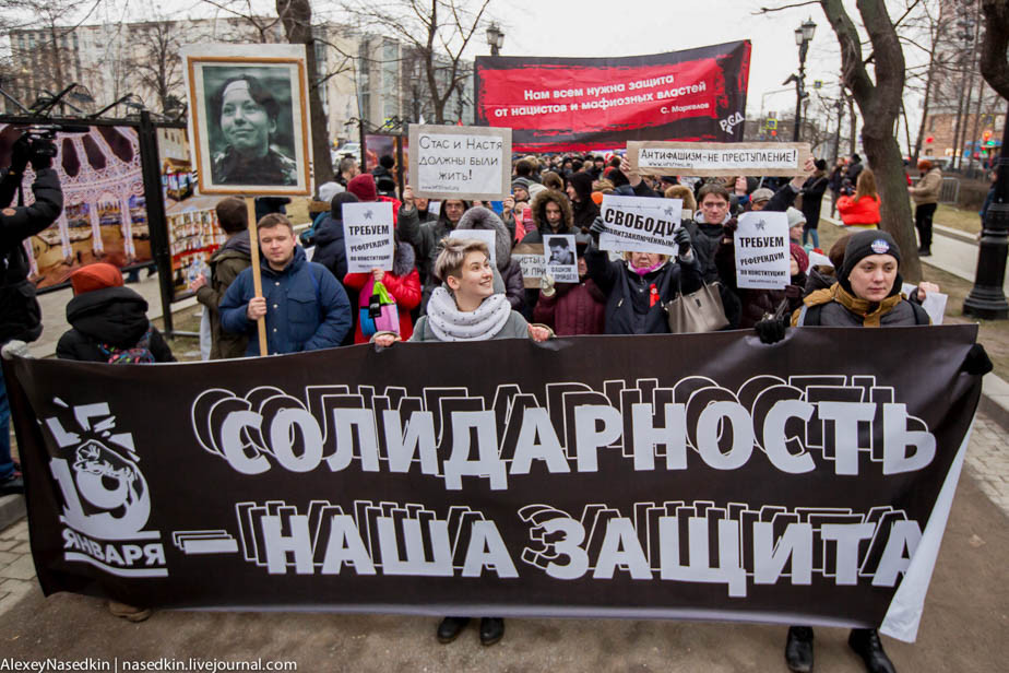 Участники акции держали в руках плакаты с надписями: «Стас и Настя, вы не забыты!», «Антифашизм – не преступление», «Смерть фашизму всех мастей»».