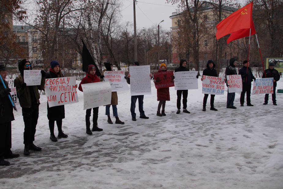 На одном из плакатов была надпись: «Дело „Сети“* – это какая-то пытка», на других - «Ваш электрошок не убьет наши идеи» и «Антифашизм – не преступление». Другие плакаты были в поддержку фигурантов «московского» и других политических дел.