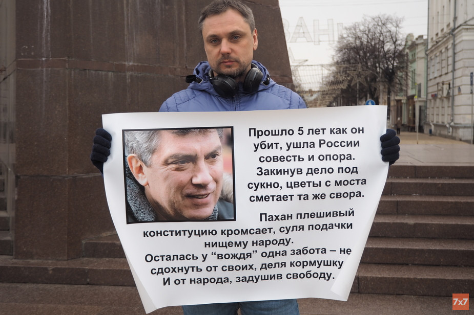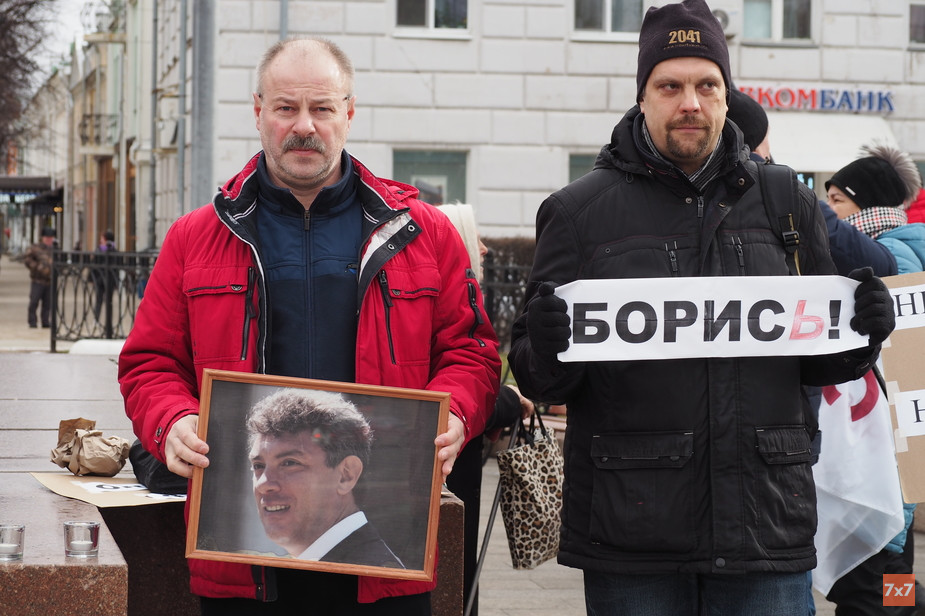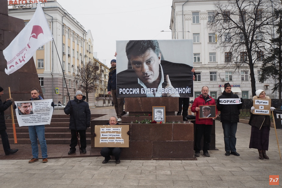 Согласованный пикет в память убитого неподалеку от Кремля политика Бориса Немцова прошел на площади Ленина с 11:00 до 12:00. На акцию памяти пришли общественники, которые разделяли его взгляды при жизни политика и встречались с ним во время визита в Рязань в октябре 2010 года. Участники принесли самодельные плакаты с надписями: «Борись!», «Путин = война», «Герои не умирают», «Нет поправкам в Конституцию, нет узурпации власти Путиным!». «Не надо менять Конституцию — менять надо Путина!».