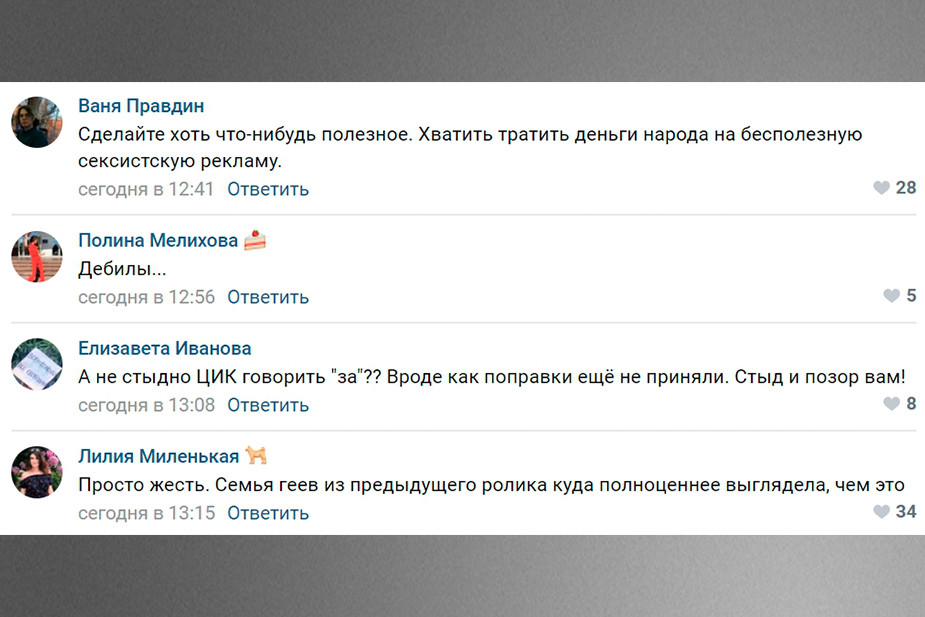 Зампредседателя гендерной фракции «Яблока» Николай Кавказский считает, что распространение такой агитации со стороны ЦИКа недопустимо. В 2016 году он подавал жалобу на содержащую, по его мнению, сексизм агитацию, но окружная избирательная комиссия отклонила ее, так как не увидела нарушений.