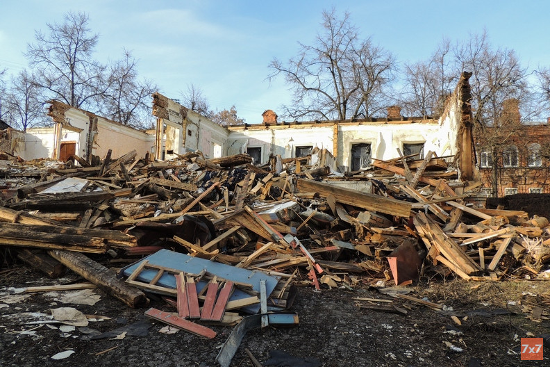 Во дворе старинной усадьбы появились груды развалин и бревна. Остался только фасад с 12 окнами. Кто и почему решил сровнять его с землей, было непонятно: никаких табличек подрядной организации рядом не было.