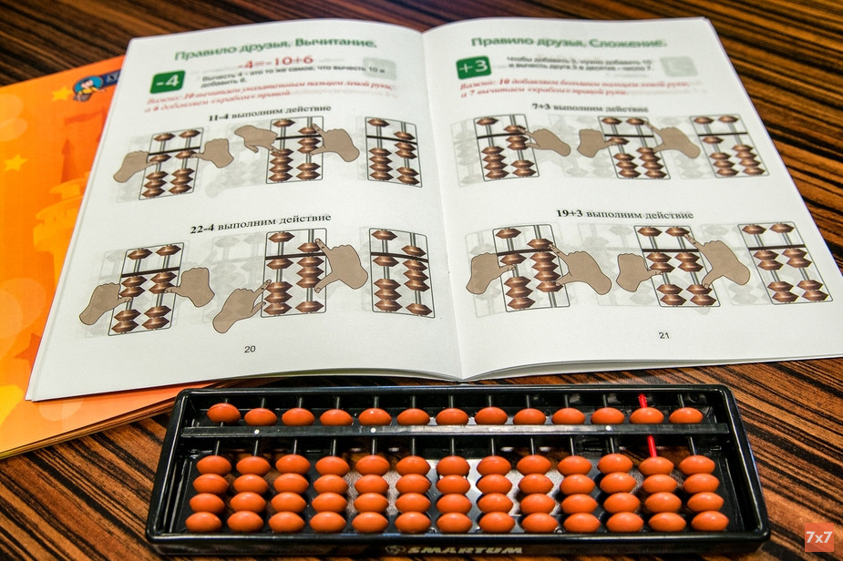 Основа курса ментальной арифметики — работа с абакусом, это древние японские счеты. Многие сравнивают абакус с русскими счетами, но в них 10 косточек, удержать которые в воображении сложно. Уже на первом занятии дети начинают работать с воображаемыми счетами: они представляют абакус и помогают себе считать с помощью пальчиков. Потом эти движения со временем уходят и дети умножают в уме двухзначные числа на трехзначные быстрее, чем на калькуляторе.