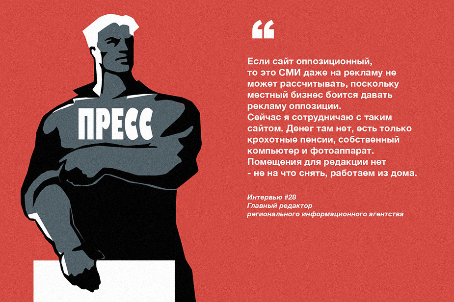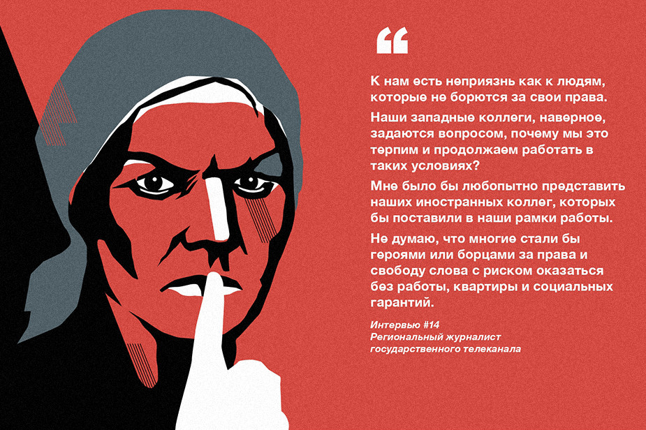 «Мы можем туда пойти, но чтобы написать об акции, нужно показать не только мнение протестующих, но и мнение чиновников. После того, как ты все это сделаешь, возьмешь комментарии, напишешь текст, чиновники решат, что лучше такое не ставить, и либо запретят публиковать, либо снимут уже опубликованный текст. Все понимают, чем все закончится, и поэтому не пишут», — из интервью с журналистом регионального онлайн-СМИ.