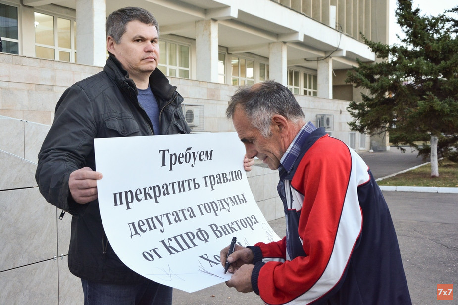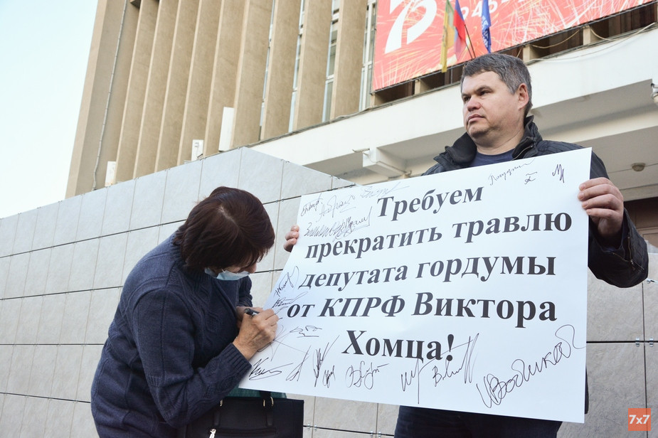 Участники пикетной очереди оставили несколько десятков подписей на плакате с надписью: «Требуем прекратить травлю депутата гордумы от КПРФ Виктора Хомца!».