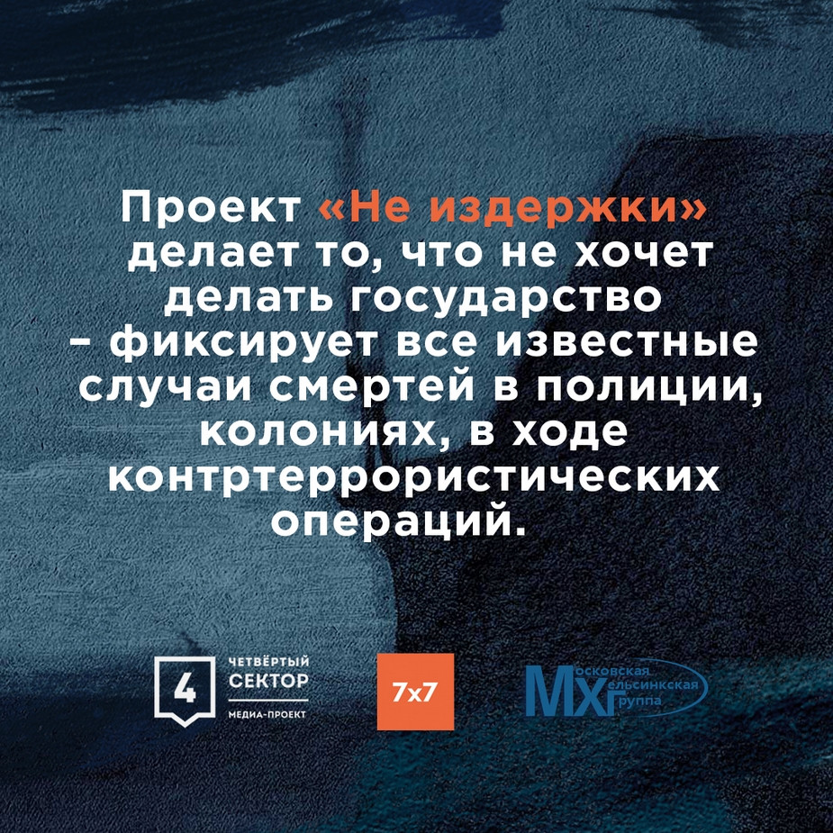Медиапроект «Четвертый сектор», Московская Хельсинкская группа и интернет-журнал «7х7» запустили совместный журналистский проект «Не Издержки». Он рассказывает о смертях в полиции, СИЗО, колониях, в ходе контртеррористических операций.