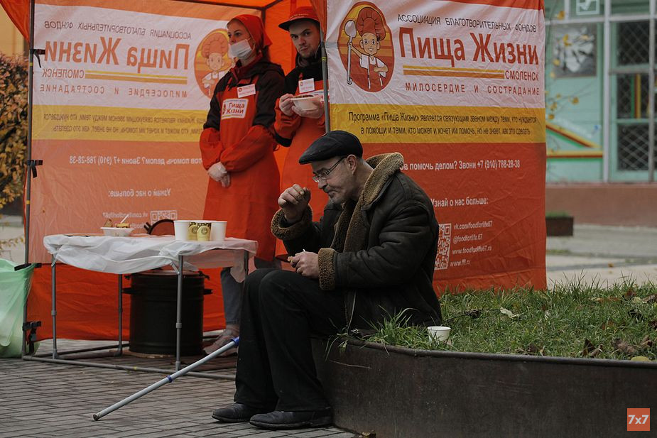 Год назад инициативные горожане решили открыть в Смоленске филиал российского благотворительного фонда «Пища Жизни» — организация помогает малоимущим и раздает горячее питание в 50 городах России. В декабре 2019 года волонтеры «Пища Жизни Смоленск» вышли на свою первую благотворительную акцию. С этого времени каждую субботу в городе появляется оранжевая палатка, в которой любой желающий может получить горячий обед и услышать добрые слова. История маленькой низовой инициативы, которая развивается без поддержки властей и состоятельных спонсоров, а иногда и при полном непонимании граждан, — в репортаже «7х7».