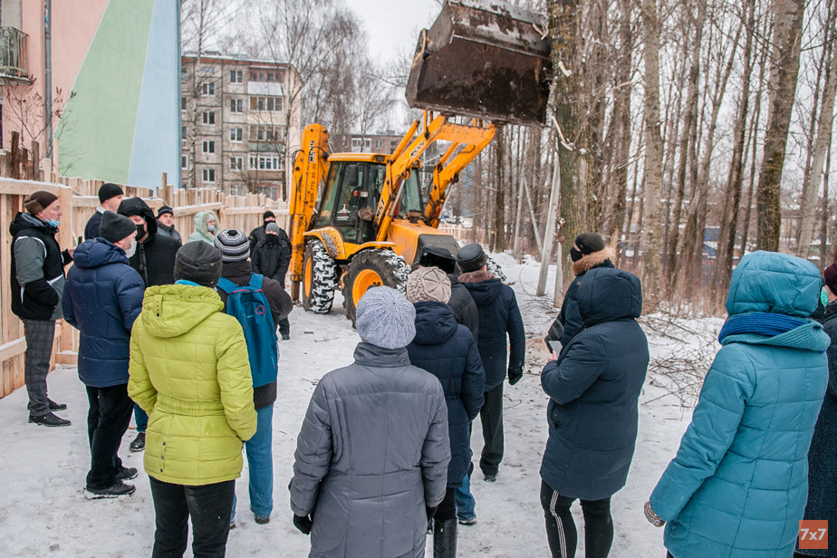 Когда жители близлежащих домов увидели, что застройщик готовится пилить тополя, они попытались помешать проезду техники на стройплощадку, встав перед экскаватором.